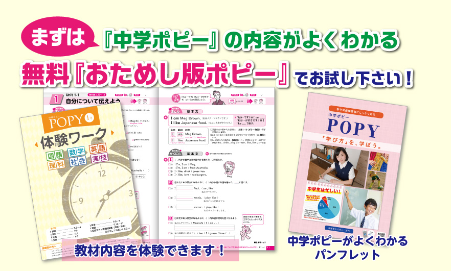 ポピー教材の内容確認されたい方には、新中学1年生お試し見本をお届けします